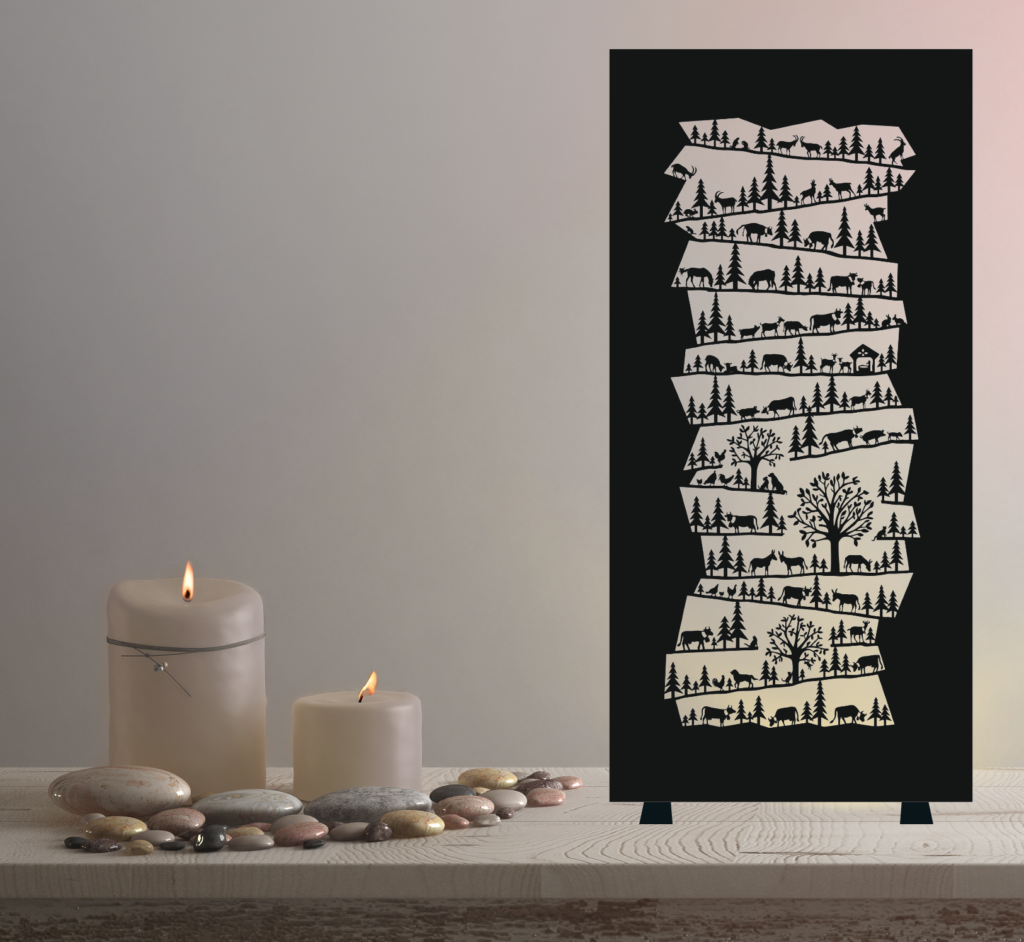 Prévue pour tenir sur ses supports, la poya peut aussi être fixée au mur, il convient alors de laisser un espace d’au moins 1 cm entre le mur et la poya, de façon à ce que les ombres ne collent pas au dessin. Il est aussi possible de suspendre la poya à l’aide de ficelle et de deux pincettes en bois. Autre possibilité, jouer sur les ombres portées ou appliquer un papier au dos de la poya et mettre une source de lumière derrière.