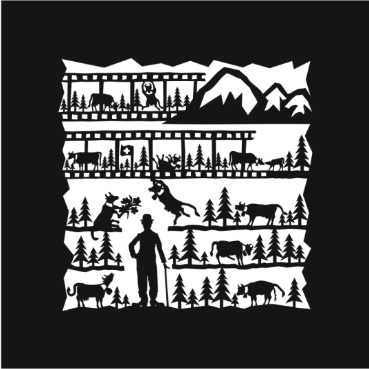 Ambiance 7e art, une vache tient des fleurs symbolisant la tendresse des films à Chaplin, une autre est crochée au film comme il le fut à l’horloge.