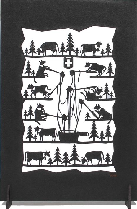 Une des vaches abandonne l’expérience fondue, collée dans le fromage elle fait demi- tour tandis que sa voisine a abusé du coup du milieu.