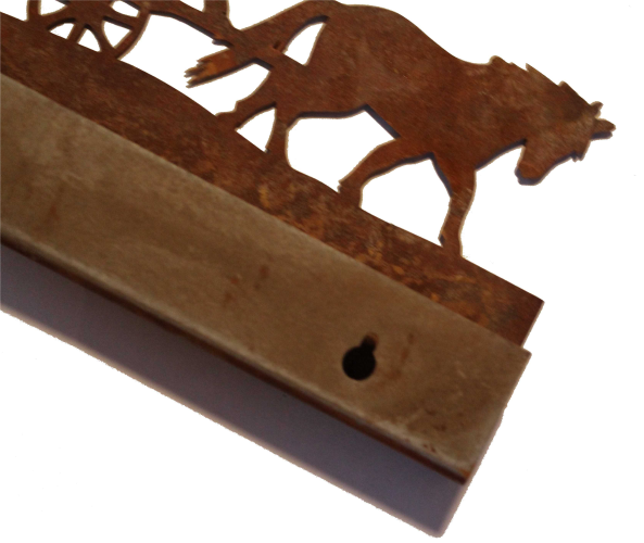 Acier Corten 1mm rouillé. Ces frises sont rouillées à l’air libre puis cirées, elles sont idéales pour une décoration intérieure.