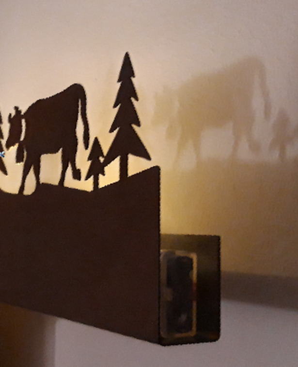 Espace prévu pour insérer un système d´éclairage par exemple boîtier à pile avec bande de leds. Se fixe au mur grâce à deux trous de passage à vis.
