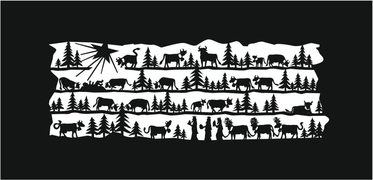 Les vaches décorées de la désalpe ont remplacés les chameaux et le petit Jésus est réchauffé par des ruminants.