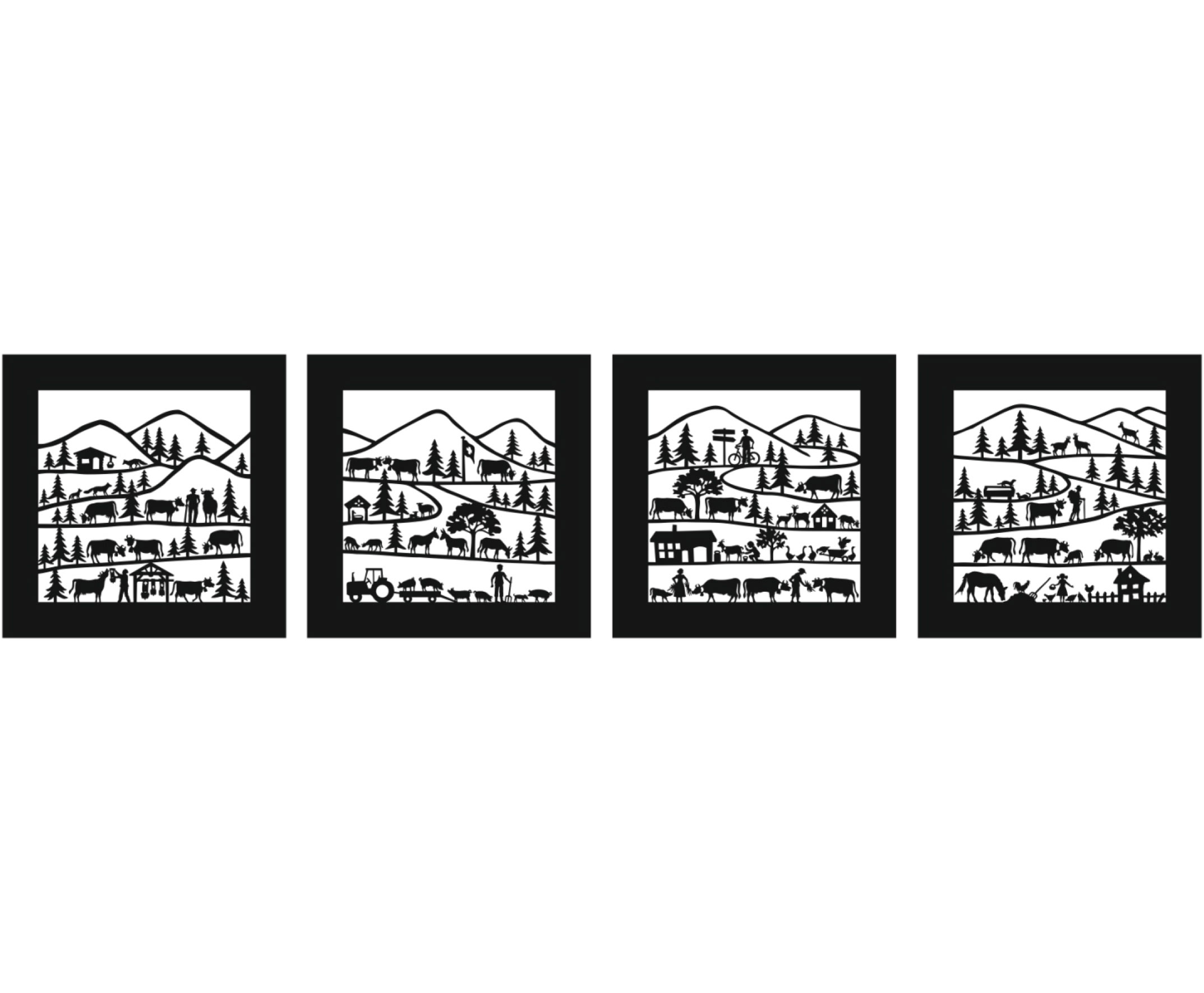 Scènes campagnardes déclinées en 4 tableaux, dont le paysage est en continuité pour former ce joyeux quadriptyque dans des détails tout en finesse