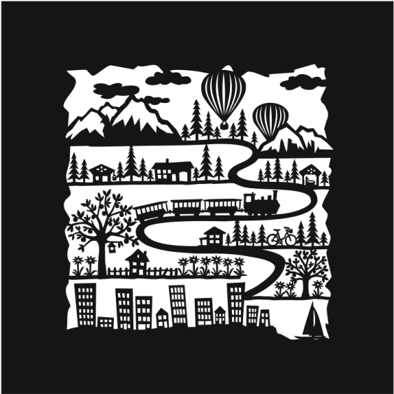 Ambiance bucolique sans vaches, représentative des paysages suisses, villes au bord du lac, campagne, trains et montagnes.